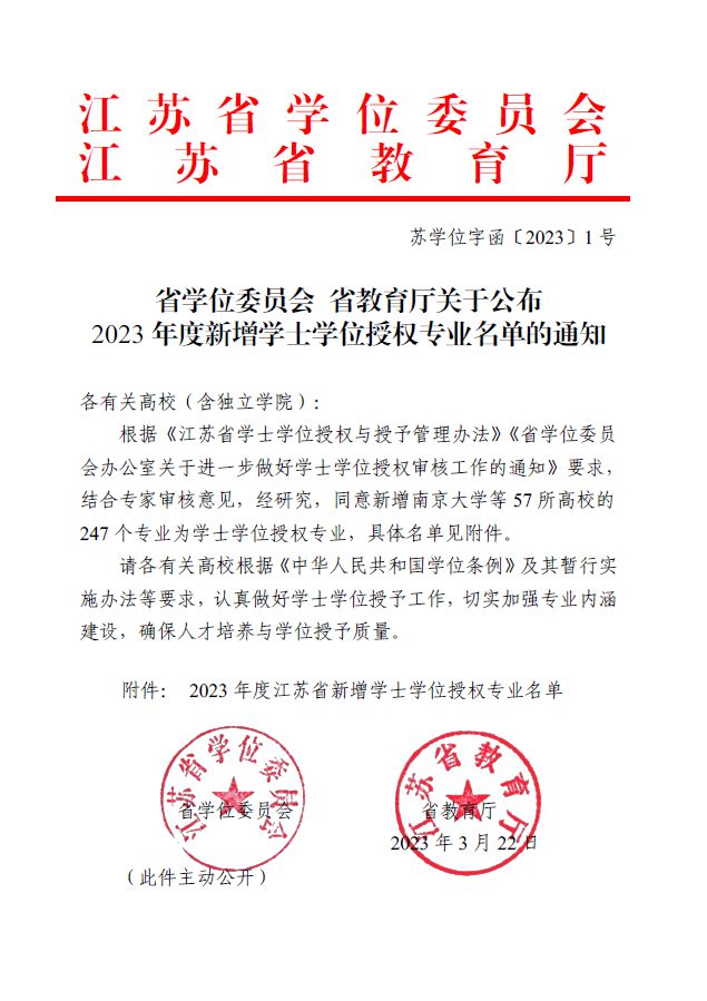 近日,省学位委员会、省教育厅联合发文公布了2023年度新增学士学位授权专业名单(苏学位字函〔2023〕1号)。我校应用心理学、数据科学与大数据技术、艺术与科技三个专业顺利获得学士学位授予权。
