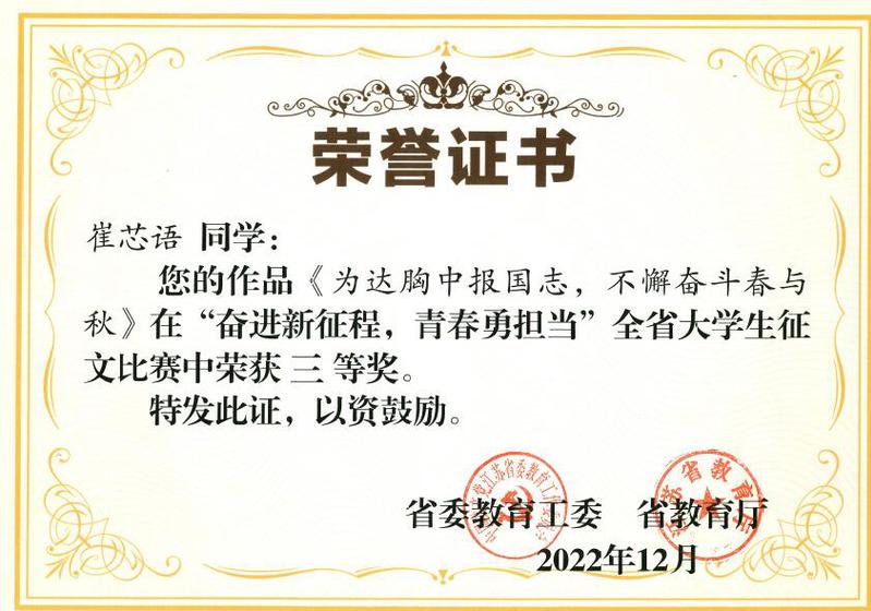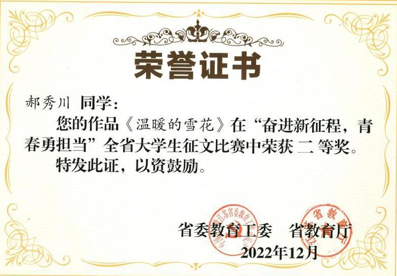 此次比赛自2022年10月底启动,历时两个月,共有110所高校参与。我校高度重视此次参赛工作,经过学院积极推荐和学校专家评审,共推荐3件征文作品代表学校参与全省评比,最终文学院郝秀川 的作品《温暖的雪花》(指导老师:王玉琴 )荣获二等奖,数学与统计学院崔芯语的作品《为达胸中报国志,不懈奋斗春与秋》(指导老师:张文菲)荣获三等奖。