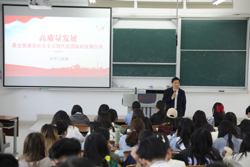 课堂上,张宏如从“高质量发展对于全面建设社会主义现代化国家的重要意义”“新时代推动高质量发展取得的历史性成就”“坚持以高质量发展为主题落实好各项经济工作”等三个部分展开,结合党的二十大决策部署、当前国内外形势、地方经济社会发展和学校“十四五”规划等情况,用生动的语言、翔实的数据、典型的案例从历史、实践、理论等视角系统阐述高质量发展。