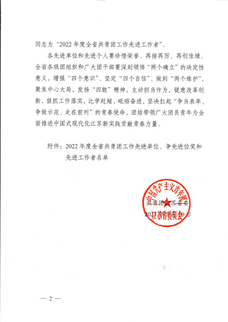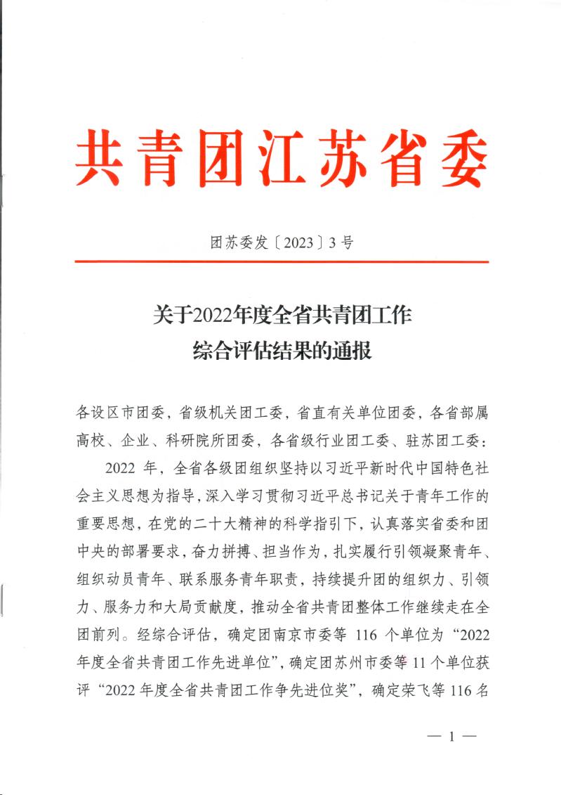 五四青年节到来之际,我校喜报连连,全校团员备受鼓舞。近日,共青团江苏省委印发《关于2022年度全省共青团工作综合评估结果的通报》(团苏委发【2023】3号),对2022年度全省共青团工作先进单位、争先进位单位和先进工作者进行了通报表扬。我校团委获评“2022年度全省共青团工作先进单位”,校团委副书记张旺获评“2022年度全省共青团工作先进工作者”。这是我校连续第二年获得年度考核优秀。
