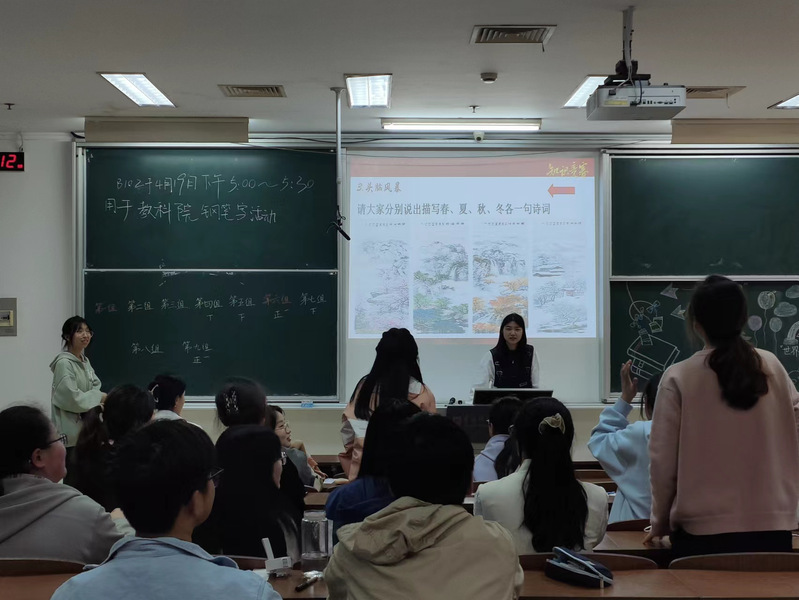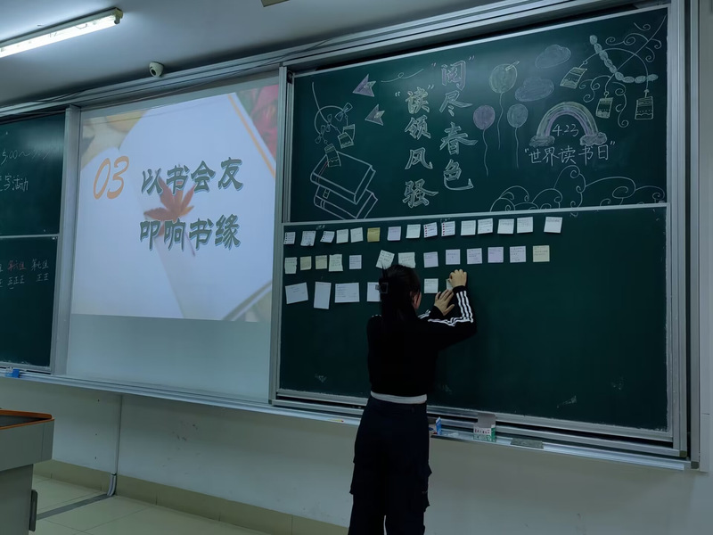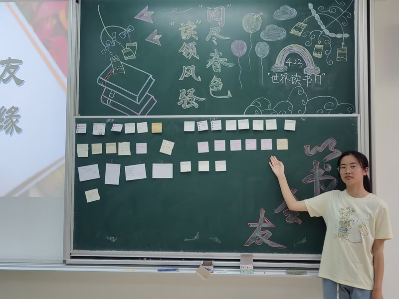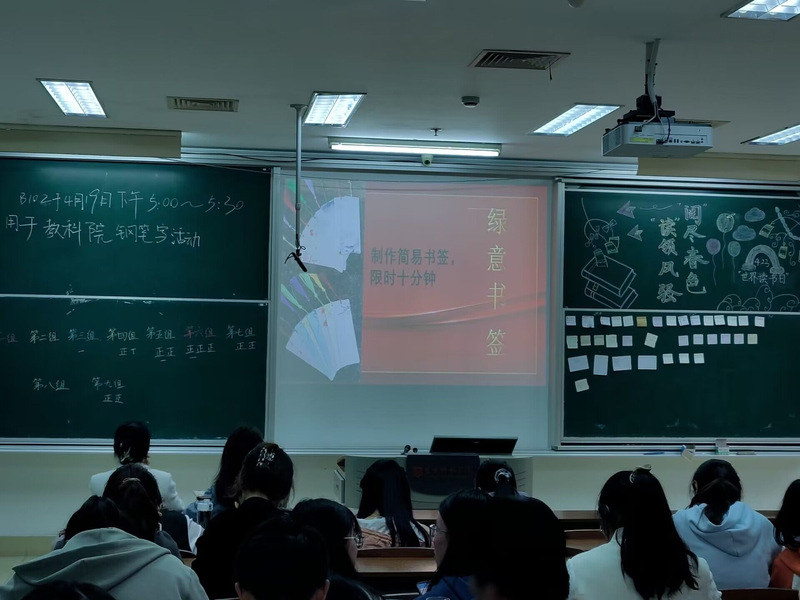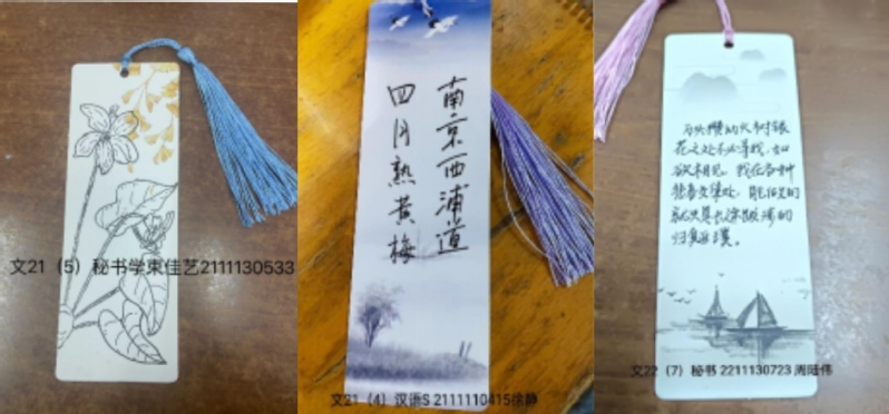 胸怀文墨虚若谷,腹有诗书气自华。为充分营造爱读书、善读书、读好书的良好氛围,4月21日,文学院开展“闻书香 忆书名 蕴书情”活动。此次活动设置了知识竞答环节,通过竞赛的方式展示各小组学生的读书积累,同学们在自己丰富充实的知识储备库中搜索答案,踊跃发言,现场洋溢着一片欢乐气氛。同学们还在现场设计了精美的词画书签,并将自己的设计灵感与大家一起分享,通过书签可以感受到同学们对阅读的无限热爱。