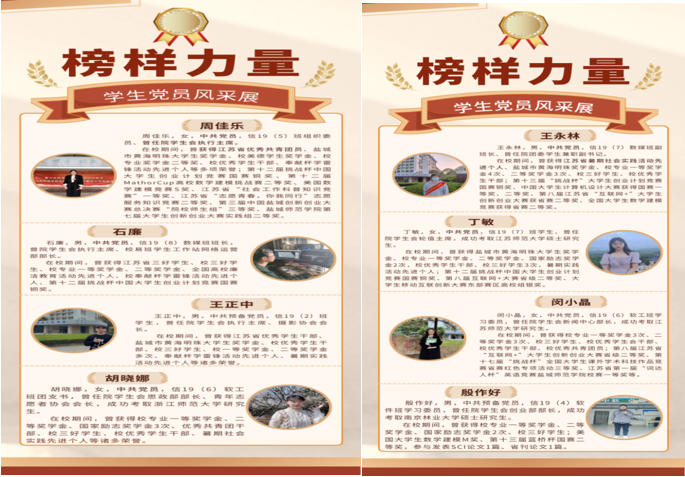 学习榜样、争做榜样。4月起,学院通过学院官网、微信公众号、宣传屏、易拉宝等多种形式,宣传展示学生党员群体的先进事迹和成绩,表扬他们矢志拼搏奋斗,不惧风雨,勇挑重担的精神,激励在校学生汲取榜样力量,积极追求进步。同学们纷纷表示,从优秀同学身上,看到了当代党员青年的先进性和模范作用,坚定理想信念,夯实学业基础,锻炼专业技能,做奋斗有为的信工人!