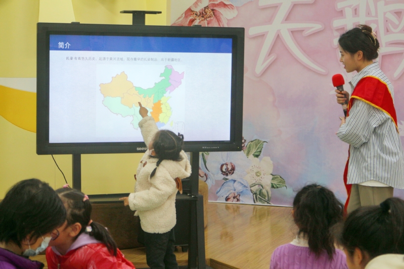 活动中,志愿者带领小朋友们一同走进有趣的扎染课堂,用生动的语言向孩子们介绍了扎染的历史文化,欣赏不同时期的扎染艺术,通过“太空老师王亚平”的视频,进一步调动孩子们对扎染的兴趣。 随后,志愿者带领小朋友们使用不同颜色的染料和橡皮筋,在布料上制作独特的图案。志愿者耐心指导孩子们如何使用材料,并协助他们解决遇到的问题,并拍照记录孩子们制作染布的过程,每个孩子的脸上都洋溢着满足、兴奋和自豪的笑容。