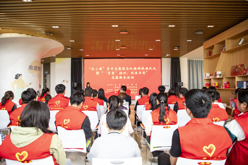 为大力弘扬志愿服务精神,汇聚青春力量,展现青春风采,5月13日下午,盐城师范学院商学院团委联合盐渎街道团委举办“盐小圈”青年志愿服务队揭牌授旗仪式,并开展了“‘青童’结对,共沐书香”志愿服务活动。盐渎街道分管领导陈惠、商学院党委副书记秦圣阳、商学院师生志愿者、盐渎街道乡村振兴计划志愿者和部分困境儿童参加活动。