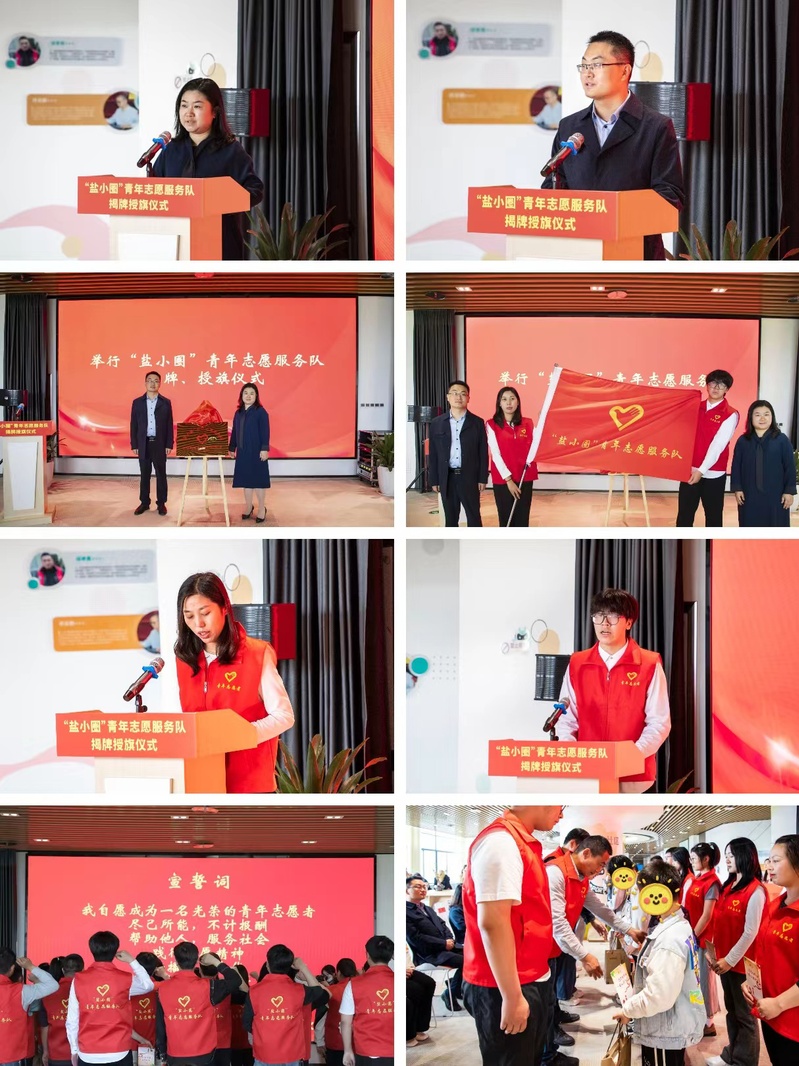 陈惠、秦圣阳为“盐小圈”青年志愿服务队揭牌授旗,志愿者代表分别进行了表态发言,并带领全体志愿者进行庄严宣誓。双方表示,“盐小圈”青年志愿服务队的成立是推动校地共建志愿服务深入融合发展的良好举措,将积极推进志愿服务进企业、进学校、进社区,确保志愿服务有序有效,扩大双方结对共建的影响力和渗透力,用志愿服务擦亮盐城市文明底色,让新时代文明实践志愿服务赋能乡村振兴。