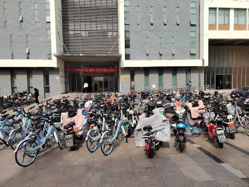 一段时期以来,求真楼前电瓶车、自行车存在乱停放现象,有时车辆停放占据楼前大半个通道,影响人员进出,给安全工作带来隐患。学校相关部门得知后,高度重视,由保卫处牵头,化学与环境工程学院、海生院明确责任,相互配合,采取切实有效措施,确保车辆规范停放。