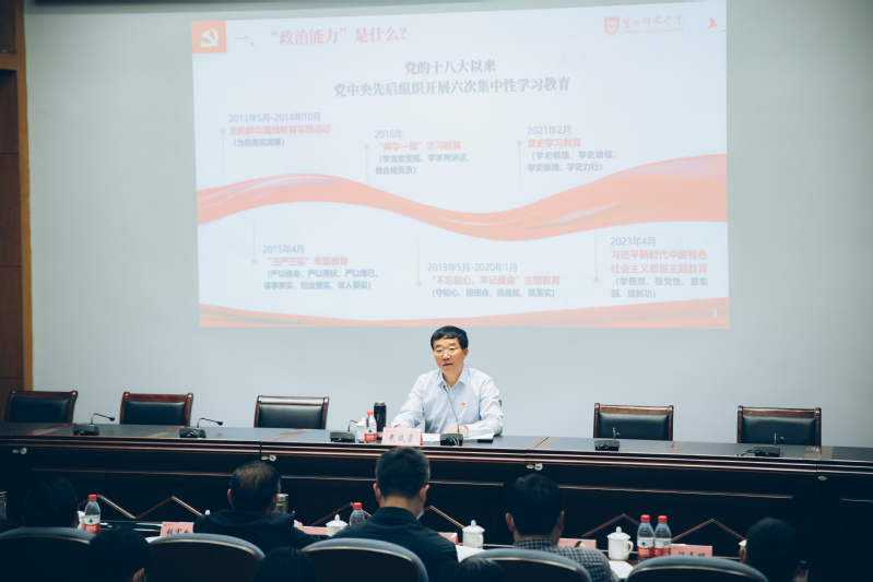 戴斌荣从“通过读原著学原文悟原理的视角,深刻认识和准确把握政治能力的概念”“坚持问题导向,提升高校干部政治能力的重要性”“坚持知信行合一,提高政治判断力、政治领悟力、政治执行力,推动学校高质量发展再上新台阶”三个方面,全面系统论述了政治能力是领导干部最重要的能力,是“第一能力”,也是领导干部全部能力和本领的核心;提高全校各级领导干部的政治能力,强化实干担当,对于推动我校高质量发展再上新台阶、办好人民满意的高等教育具有十分重要的意义。