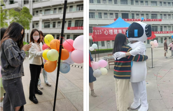 活动分为“和烦恼说拜拜”与“跟拥抱说嗨嗨”两个部分。参与活动的学生把烦恼和焦虑写在气球上,通过自己喜欢的方式踩碎气球,活动场上响起了一阵阵噼里啪啦的爆破声。随着气球被逐个踩破,同学们的压力和负能量也随之消散,完成了一次减压的心灵旅程。活动中,可爱的机器人玩偶给路过的同学送上了温暖的抱抱,以无声的拥抱传递温暖、传递快乐,同学们的脸上洋溢着幸福的笑容。