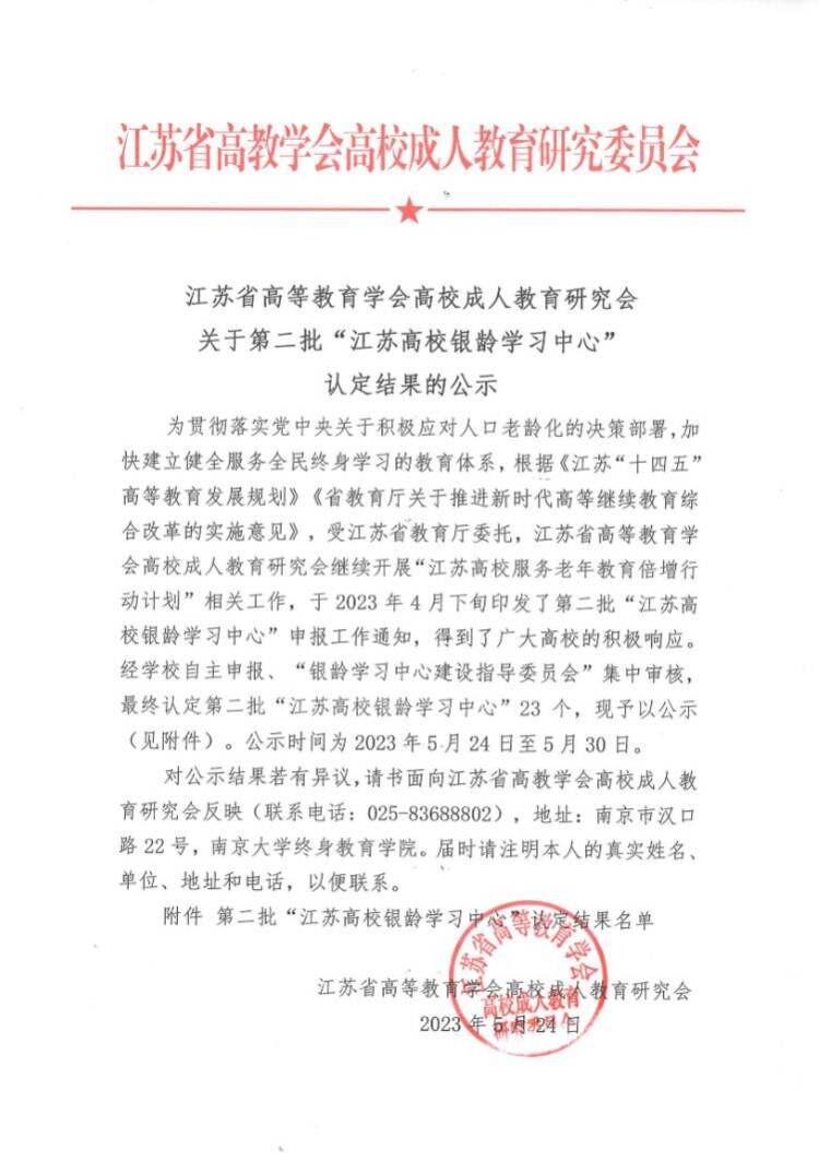 根据《江苏“十四五”高等教育发展规划》《省教育厅关于推进新时代高等继续教育综合改革的实施意见》,受江苏省教育厅委托,江苏省高等教育学会高校成人教育研究会开展“江苏高校服务老年教育倍增行动计划”相关工作,下发了第二批试点建设“江苏高校银龄学习中心”申报工作通知。我校积极响应满足老年群体多元学习需求的社会号召,学校领导高度重视,周密部署安排、精心组织筹划,继续教育学院认真准备、撰写申报资料。最终,经过专家组遴选,我校成功入选。
