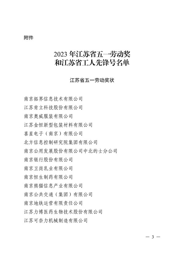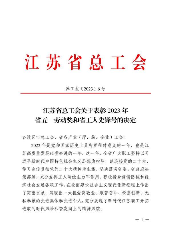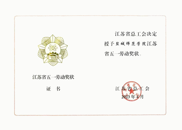 为在全社会弘扬劳动精神,培育新时代新风新貌,日前,在江苏省工会第十五次代表大会上,省总工会发布了《关于表彰2023年省五一劳动奖和省工人先锋号的决定》,对全省涌现出来的先进集体和先进个人进行表彰,我校荣获“江苏省五一劳动奖状”。