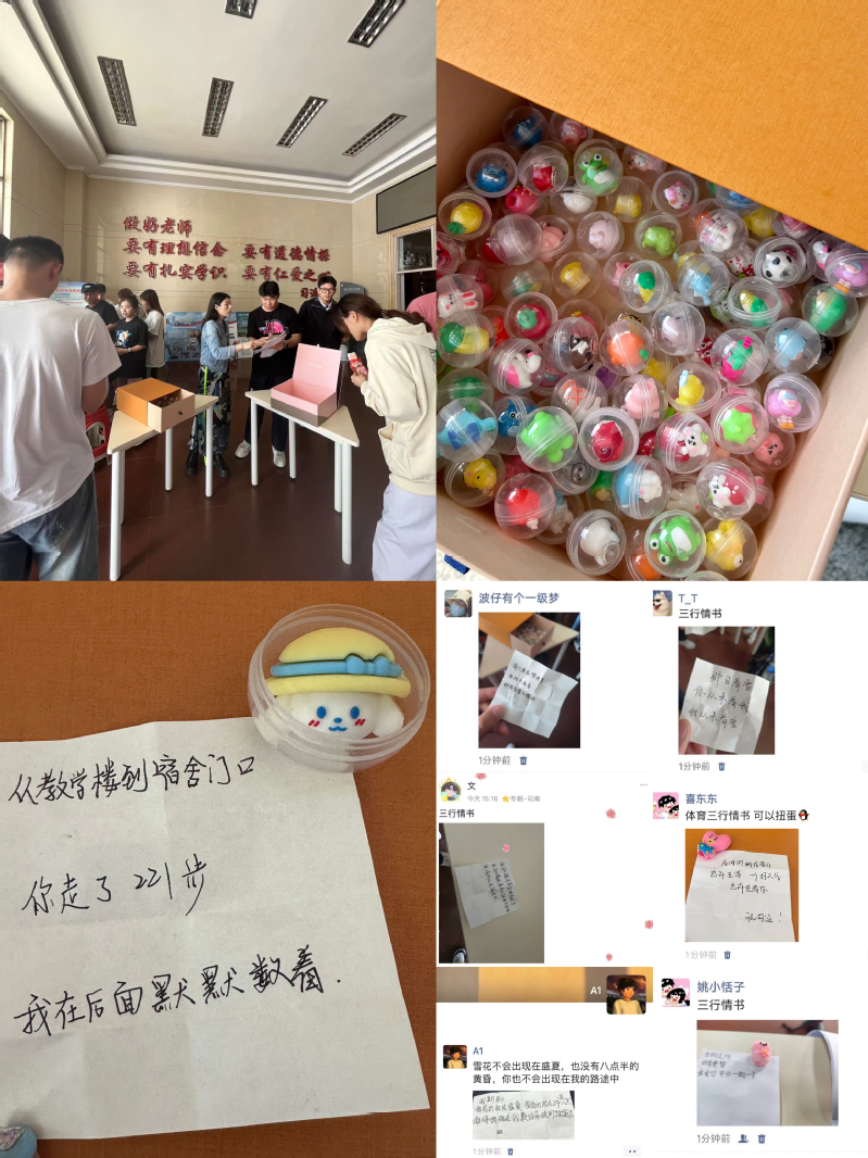 你敢相信传递情书也能像抽盲盒一样吗?体育学院开展“以诗之名,笔墨传情”三行情书活动,鼓励学生积极创作三行情诗,歌颂亲情友情爱情,并将其放入扭蛋中进行交换。本活动为同学们搭建一个分享爱与关心的平台,鼓励学生更加自由、直接地表达内心感受,体会情感表达的重要性,缓解内心情感压力,提升心理健康水平和自我调适能力,让温暖与爱遍布整个校园。