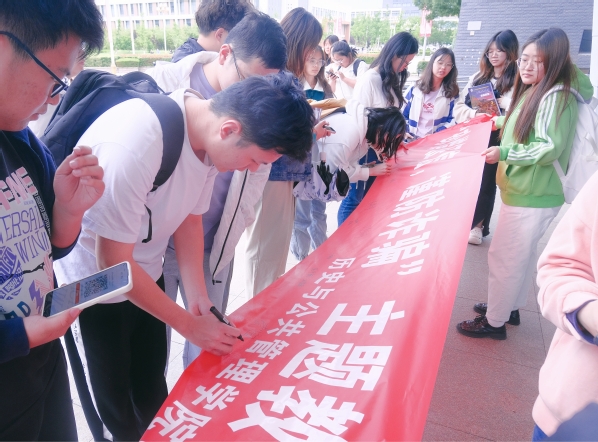 举办一次横幅承诺签名活动。在公共教学楼西门组织开展“珍惜征信、谨防诈骗”主题横幅承诺签名活动,活动伊始由组织者向大家发起珍惜征信、谨防诈骗的倡议与动员,活动得到学生们的热烈响应,之后在组织人员的引导下在横幅上郑重地签下了自己的名字。