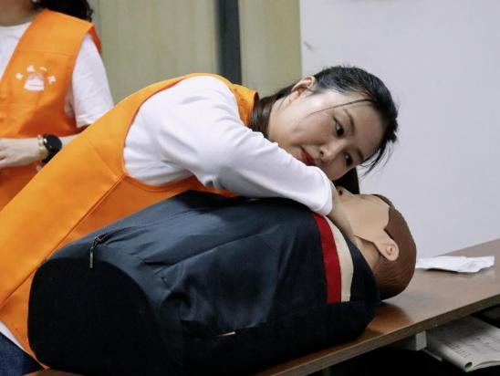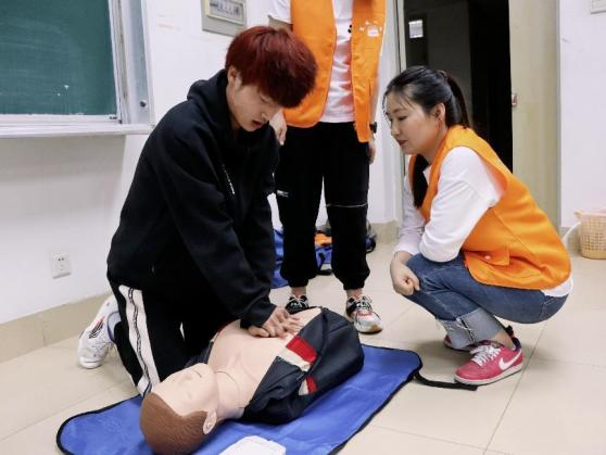 讲座采用理论知识讲解加观看视频的方式,科普小视频对心肺复苏、海姆立克急救法进行了系统讲解。现场医护人员使用假人模具展开急救模拟,提醒同学遇到周围人员心脏骤停、异物堵塞气管等突发情况要保持冷静判断情况,并拨打120,在救护车来之前把握黄金急救时间尽快展开急救。
