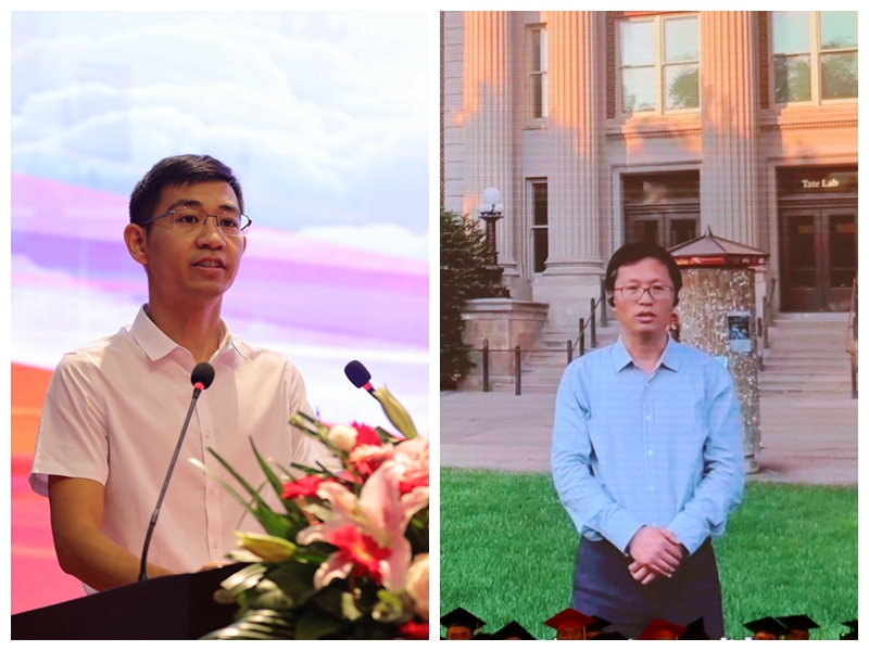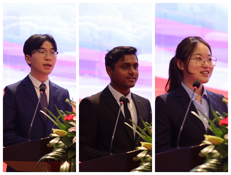 海洋与生物工程学院毕业班班主任、副教授夏文龙老师,江苏省优秀毕业生、2023年江苏省委组织部选调录用者商学院郝俊尧同学,国际教育学院孟加拉国留学生穆巴同学,文学院2021级汉语言文学师范专业本科生任艺同学分别作为教师代表、毕业生代表、留学生代表和在校生代表发言。我校政史系00届校友,上海交通大学体育系主任,博士生导师王坤教授通过视频为毕业生送上毕业祝福。