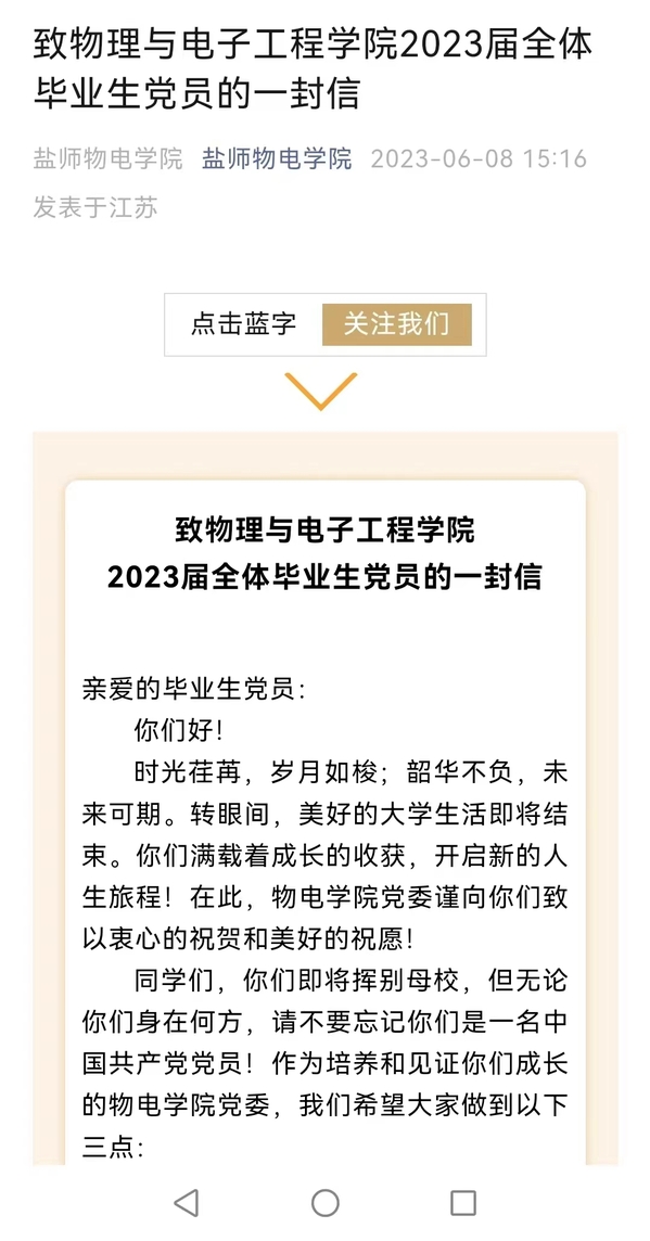 一封信寄托学院对学生党员的殷切希望。毕业之际,学院党委向毕业生党员发出致物理与电子工程学院2023届毕业生党员的一封信。送出衷心祝福的同时,也对毕业生党员提出三点要求,希望全体毕业生党员能够努力做到不忘初心,坚定信仰;牢记使命,播撒信仰;敢于斗争,维护信仰。