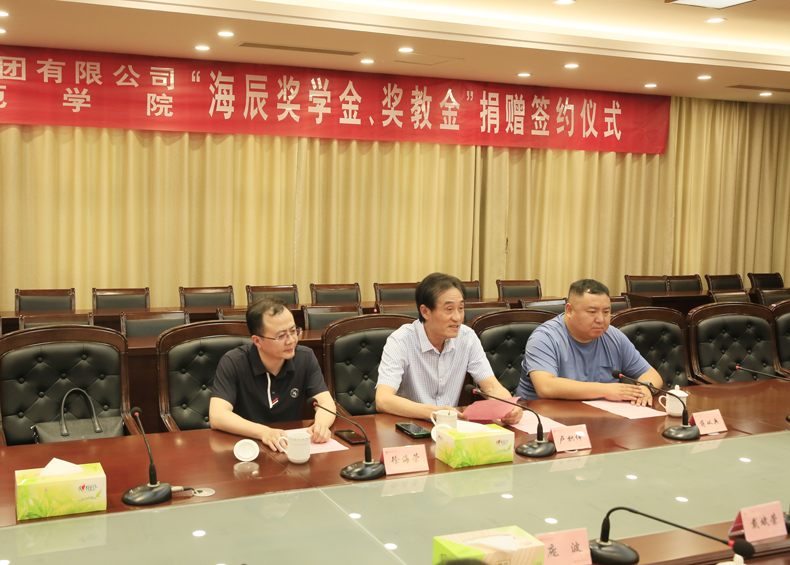 卢枳伸高度赞赏我校在人才培养、学科建设和社会服务工作中取得的成绩。他介绍了江苏海辰科技集团的发展历程与企业现状,回顾了2013年以来双方在海珍品健康养殖技术领域开展的卓有成效的工作,同时对取得的成果和效益表示满意。他指出,学校发展前景好,双方合作空间广阔,希望通过本次“奖学金、奖教金”的设立,为学校优秀人才培养做出更大的贡献。未来,江苏海辰科技集团将一如既往地支持国家高等教育事业、生态文明建设和学校高水平师范大学建设,也希望在产学研技术开发与成果转化、应用型人才培养等方面同学校加强合作。