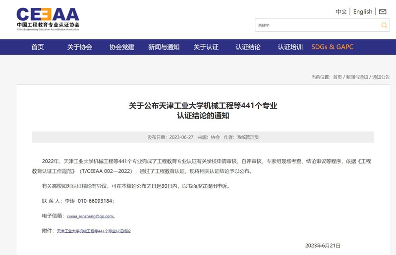 近日,中国工程教育专业认证协会发布《关于公布天津工业大学机械工程等441个专业认证结论的通知》,我校软件工程专业通过认证,有效期6年(2023年1月-2028年12月),是我校首个通过工程教育认证的专业,也是继我校14个师范类专业通过认证以后,在专业认证方面取得的又一重大突破。