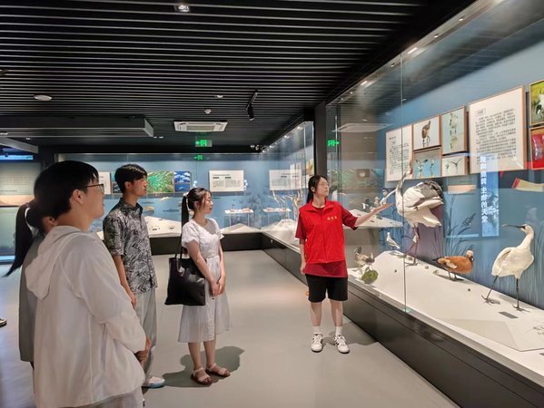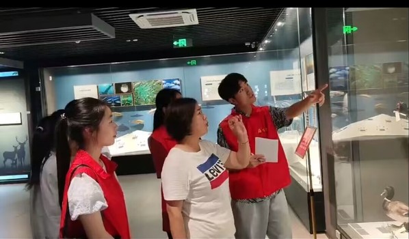 学习交流结束后,团队成员结合自身对保护湿地生态的理解,给前来博物馆参观的游客进行展馆讲解,宣传湿地保护的重要性以及盐城人民为促进黄海湿地保护所作的努力。此外,团队成员采访了游客对于湿地保护的看法,并结合生物专业知识和此次实践所获对游客开展环保科普宣传。