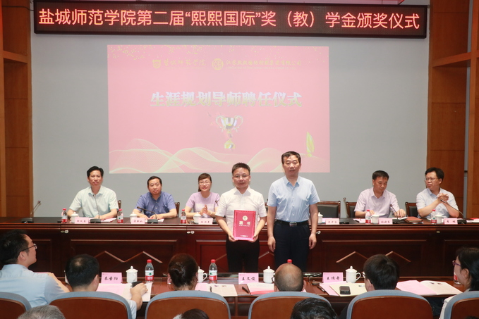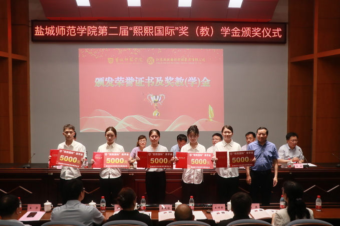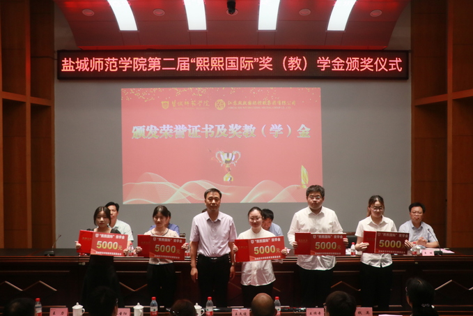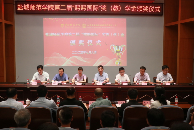 7月8日下午,盐城师范学院第二届“熙熙国际”奖教(学)金颁奖仪式在厚德楼二楼西会议室隆重举行。学校党委书记戴斌荣,江苏熙熙国际控股集团董事长梁中宝,副董事长、副总经理顾洪美,副总经理王文俊、杨胜惠出席颁奖仪式。商学院党委副书记、院长殷凤春主持仪式。