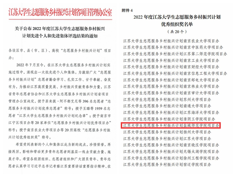 日前,江苏省青年志愿者协会、江苏大学生志愿服务乡村振兴计划省管理办公室公布2022年度江苏大学生志愿服务乡村振兴计划先进个人和先进集体评选结果,盐城师范学院项目办荣获“志愿服务乡村振兴计划优秀组织奖”称号。