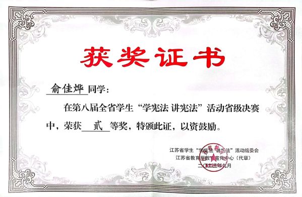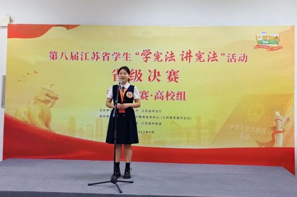 又讯 9月24日,由江苏省教育厅举办的第八届全省学生“学宪法 讲宪法”活动在南京审计大学举行。法政学院俞佳烨同学荣获演讲比赛二等奖,为我校荣誉榜上再添一笔新的辉煌。本次“学宪法 讲宪法”活动自8月开始校内选拔,俞佳烨同学通过校赛和省赛初赛进入本次决赛比拼。决赛期间,俞佳烨同学两天一夜争分夺秒、精心备赛,用法治的信仰和不懈地努力荣获佳绩。