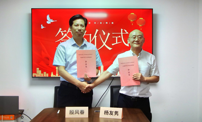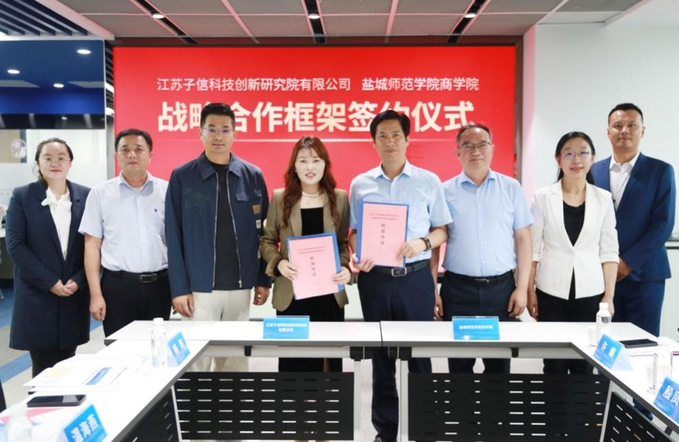 在江苏子信科技创新研究院有限公司,苏州校友会秘书长席军波、江苏子信科技创新研究院有限公司董事长温海燕热情接待来访人员。温海燕介绍公司在国际合作办学、MBA培养、企业家培训等方面的情况,曹明介绍了我校申硕和研究生联合培养等方面的情况。双方代表签署校企战略合作框架协议。