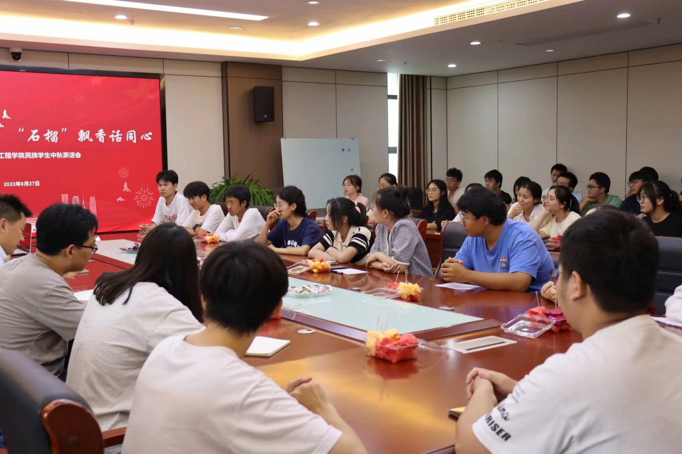 为持续巩固和铸牢中华民族共同体意识,画好民族进步“同心圆”,不断提升学院民族学生教育管理服务水平,帮助民族学生更好地适应大学生活,助力学生成长成才。9月27日下午,化学与环境工程学院在生化教学楼四楼西会议室召开“明月遥寄相思梦,‘石榴’飘香话同心”——民族学生中秋茶话会。学院党委书记刘洋、副书记谭瑾,专业课教师、辅导员代表及45名民族学生参加此次活动,茶话会由辅导员李婷婷主持。