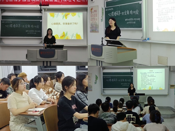 心理委员是推动学院心理健康教育高质量发展的重要群体,是打通心理工作最后一公里的重要角色。为此,学院专门组织各年级、各班心理委员进行培训。通过老师耐心细致讲解,各班心理委员进一步熟悉了学院心理健康教育工作,提高了与同学共情、倾听同学心声的能力,加强了对自己工作的热情与认同感。