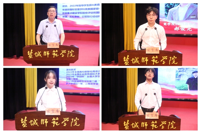应用经济系主任陈宏付作为教师代表勉励同学们用奋斗青春书写精彩人生。学院2023届优秀校友代表郝俊尧结合自身成长经历分享了大学四年的真挚感悟。金工21(7)班黄婷同学作为高年级学生代表向新生分享在商院的学习收获。电商23(6)班陈哲同学作为新生代表表达了对未来大学生活的憧憬。
