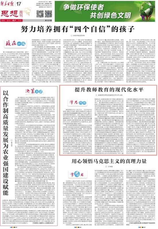 10月17日,《新华日报》思想周刊刊发我校党委理论学习中心组理论文章《提升教师教育的现代化水平》。近年来,学校党委理论学习中心组高度重视中心组学习工作,坚持不懈用习近平新时代中国特色社会主义思想凝心铸魂,以上率下跟进做好党的创新理论成果的学习,特别是深入学习习近平总书记关于教育的重要论述,不断创新学习形式,注重成果转化运用,为推进学校事业高质量发展提供坚强思想保证。
