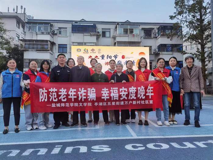 秋来又重阳,情系桑榆晚。10月23日正值重阳佳节,为进一步弘扬尊老敬老的优良传统,不断增强老人的获得感、幸福感、安全感,文学院联合亭湖区五星街道万户新村社区、盐城市交警队、亭湖区城乡居民社会养老保险中心、盐城市税务局开展“九九重阳节 浓浓敬老情”社区志愿服务活动。