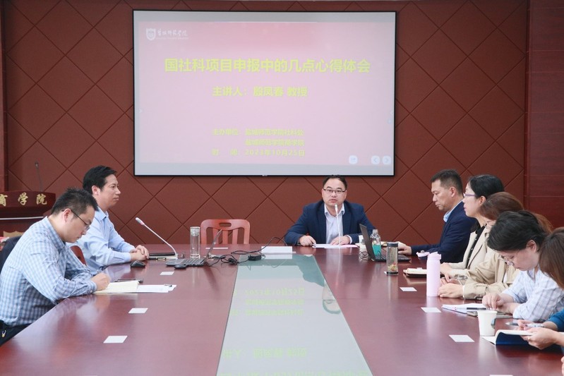 为进一步推动我校有组织科研的有效实施,提升教师的科研综合能力和项目申报质量,10月25日下午,本学期第二场国家社科项目申报专题讲座在逸夫楼三楼会议室成功举办,本次论坛由社科处、商学院主办。商学院党委副书记、院长殷凤春作《国社科项目申报中的几点心得体会》讲座,商学院党委书记刘振亚、副书记秦圣阳、副院长钱英、外国语学院副院长于胜博等,我校国家社科项目申报教师及近三年新进青年教师100余人参加讲座,讲座由社科处副处长罗兴奇主持。