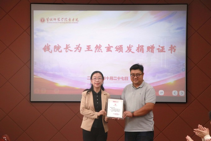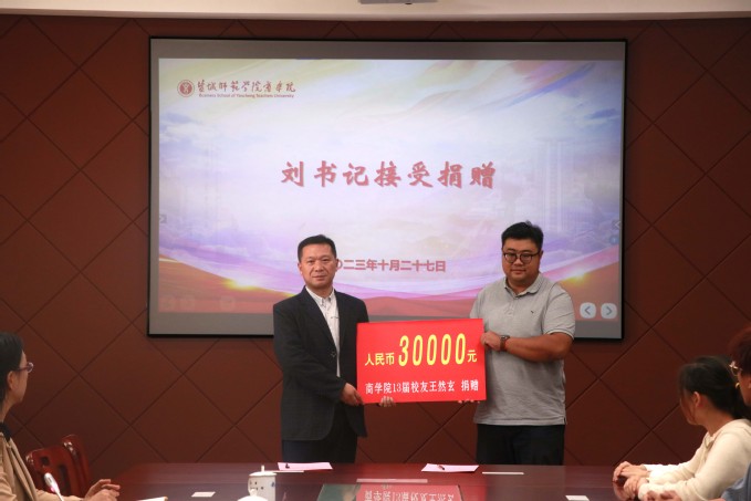 10月27日上午,商学院在逸夫楼三楼大会议室举行校友捐资助学活动。我校商学院 2013 届杰出校友王然玄,商学院党委书记刘振亚,党委副书记、院长殷凤春,学校校友办主任、校教育基金会秘书长李慧出席捐赠仪式,商学院党委副书记秦圣阳主持仪式。