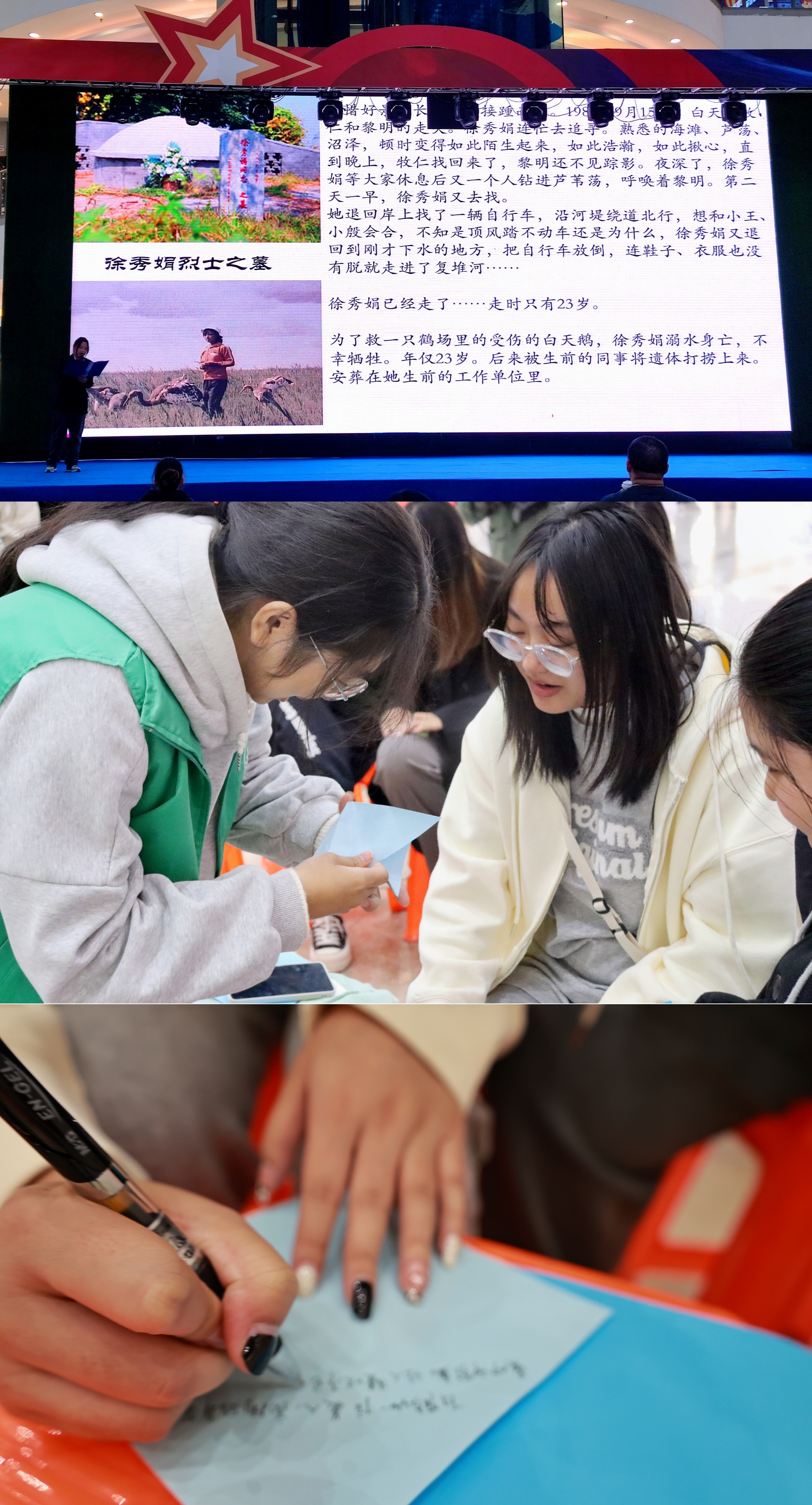 为纪念徐秀娟女士为野生动物保护事业做出的卓越贡献,提高公众对湿地及野生动物保护工作的重视程度,11月10日晚,文学院联合盐城市生态环境保护宣教中心、盐城市生态环境局盐南高新区分局和盐城市绿之缘环保志愿者服务中心,在盐城市宝龙广场共同开展“追鹤忆源起 念徐传薪火”——纪念徐秀娟女士去世36周年暨野生动物保护宣传活动。