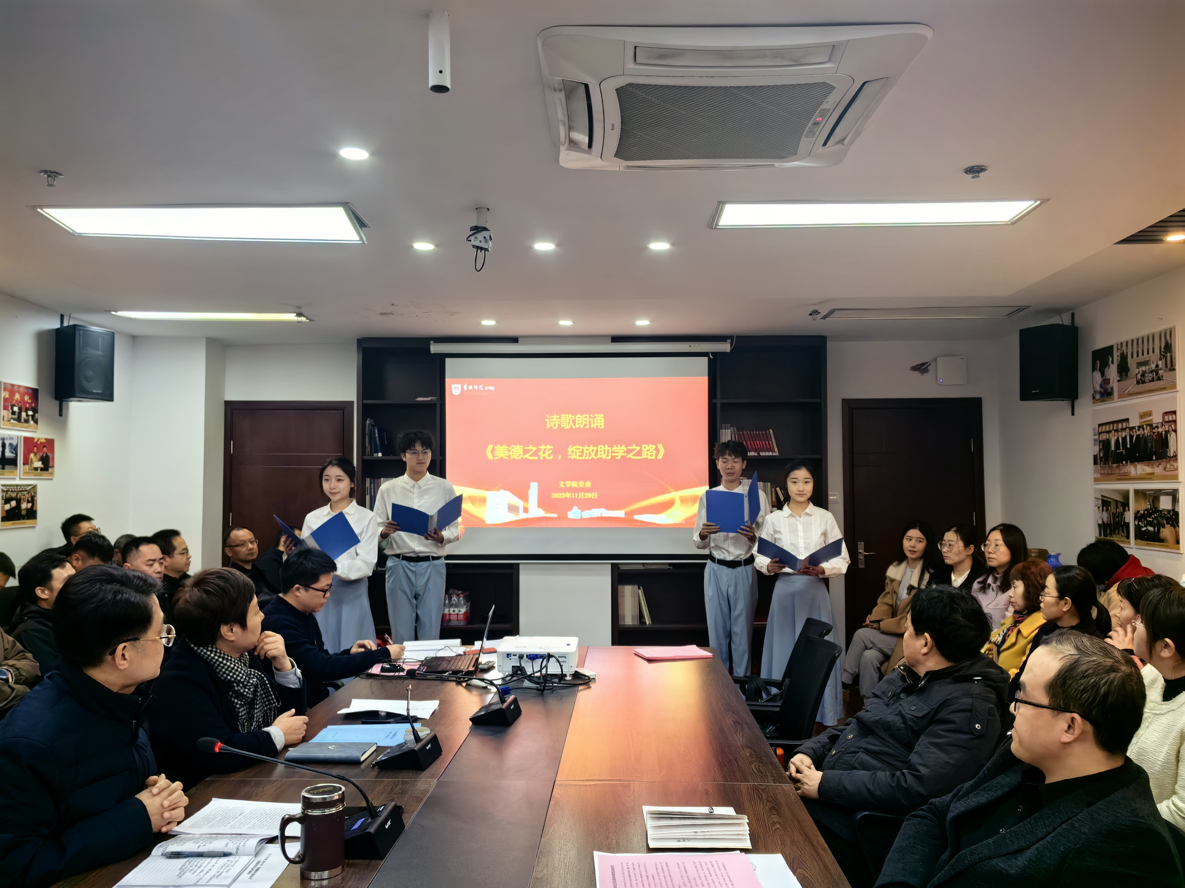 文学院院长李尧饱含深情地领学学校官微推送的纪念文章《今天,我们送别这位百岁老人》。文学院朗诵协会学生朗诵献诗《美德之花,绽放助学之路》,共同缅怀我校离休老干部包斌老师。学院教师纷纷表示要向包老学习,进一步增强坚定理想、塑造心灵、传承文明的使命感,努力提升自身道德水平。副院长冯青青领誓师德建设承诺,全体教师签署教师师德建设承诺书。
