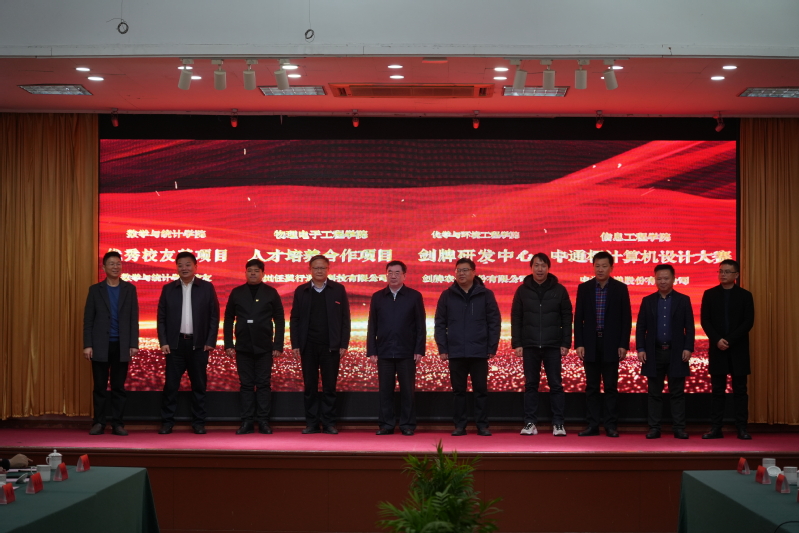 会上,还举行了校友合作项目发布仪式。江苏剑牌农化股份有限公司出资100万元,与化学与环境工程学院合作成立“剑牌研发中心”。物理与电子工程学院、信息工程学院分别与苏州任翼行通讯科技有限公司、中通快递股份有限公司签订人才培养合作协议。数学与统计学院启动“数学优秀校友基金”。