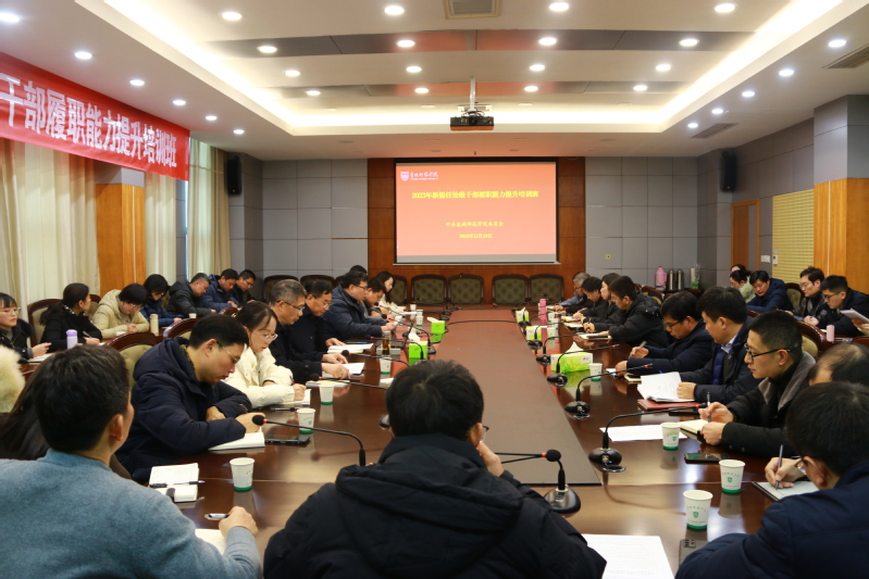 12月19日下午,学校党委书记戴斌荣在厚德楼一楼东会议室为新提任处级干部作专题培训报告。学校党委常委、党委组织部部长岳峰主持报告会。