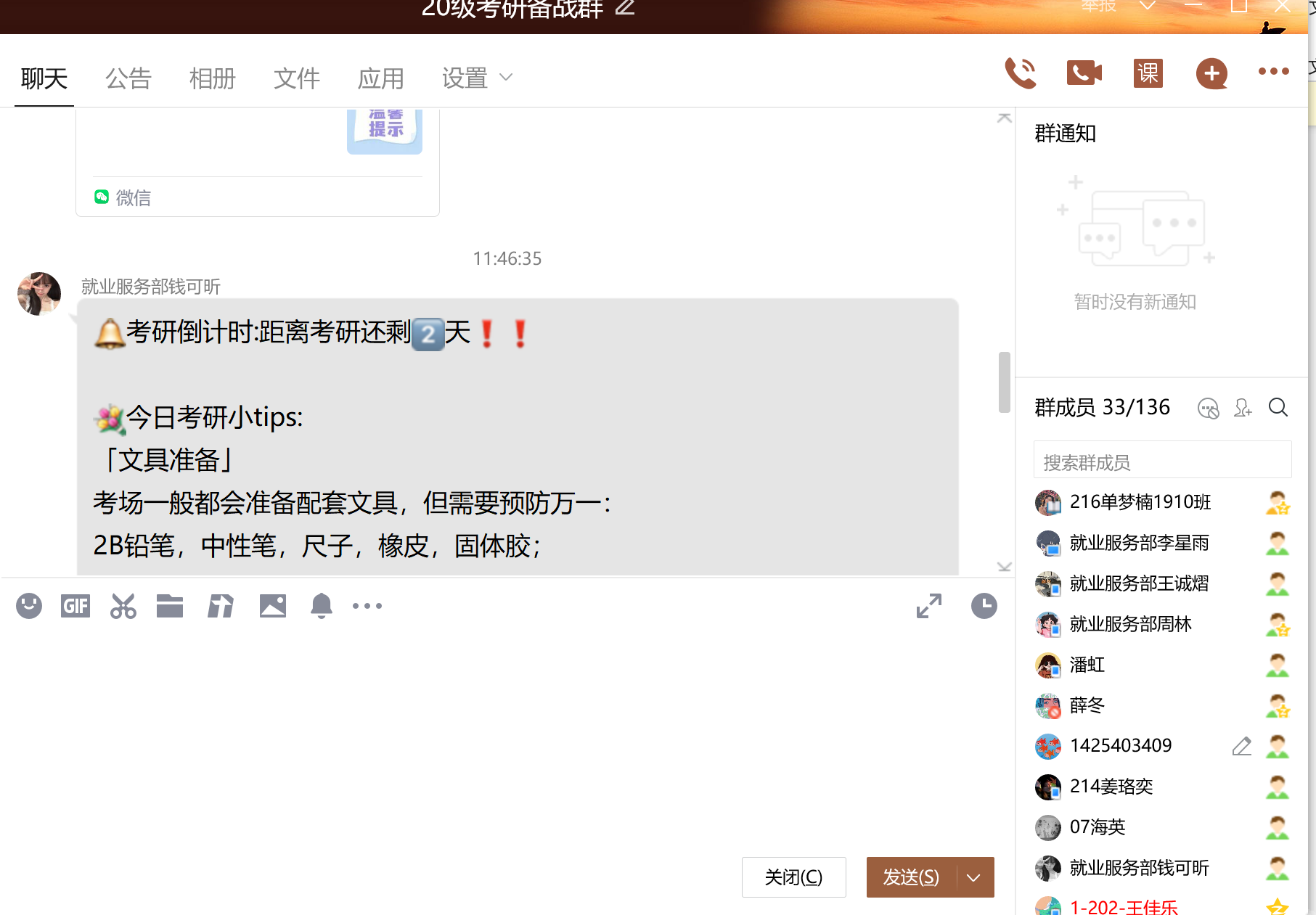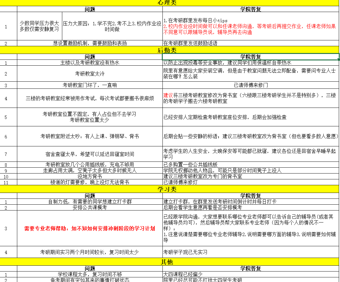 为做细考研学子服务工作,学院积极组织各年级开展考研经验交流会,帮助同学们更好地应对考研疑惑,改进自身学习方法,提高学习效率。学院还通过定期发放问卷、建立考研打卡自律群、准备考研小“惊喜”、定点解决问题等方式关心学生,提升考研学子信心。