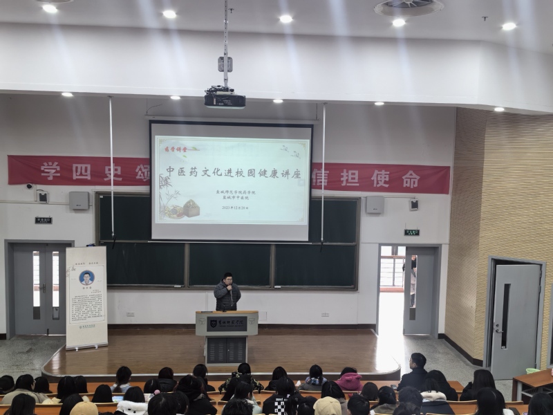 药学院、后勤保障集团联合开展第四届“药食同源杯”药膳文化节药膳制作大赛,并共同举办江苏省第十三届“中医药就在你身边”中医药文化进校园活动。12月20日,盐城市中医院主任中医师常小丽,副主任中医师洪雪兰在新长校区卫生所开展义诊活动。两位医师通过望、闻、问、切等中医诊疗方法把脉问诊,并提出对症可行的治疗建议和调养方法。盐城市中医院副主任中医师郭军华开展中医药文化进校园健康讲座。郭军华以“中医四季养生”为主题,从四季特点出发普及了四季养生常识,并着重讲解了9种不同体质类型的辨识方法、疾病倾向和调养方式。