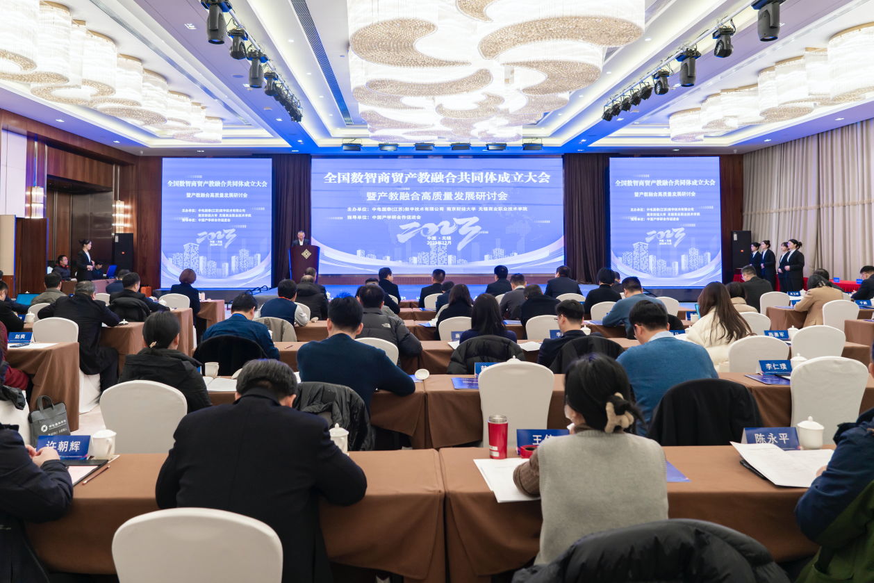 12月23日,全国数智商贸产教融合共同体成立大会暨产教融合高质量发展研讨会在江苏无锡举行。本次大会由中电国泰(江苏)数字技术有限公司、南京财经大学、无锡商业职业技术学院等单位共同发起,无锡商业职业技术学院承办,中国产学研合作促进会指导和支持,无锡商业职业学院校长徐汉文主持会议。我校商学院院长殷凤春教授和工商管理系主任张天明博士应邀参加本次会议。