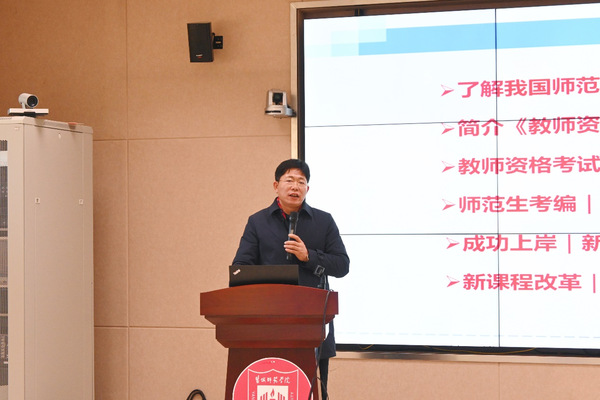 冯小勇回顾了我国师范教育的百年实践征程,分析了教育事业对于现代社会的重要意义,强调了教资考试的重要性、必要性,论述了现代师范生所应具备的职业素养、基本素养和教育教学能力。他还结合自身从教30多年的历程,介绍了教师发展、职称晋升、新课程改革等相关情况,激励学生们脚踏实地、潜心钻研,在更加广阔的舞台上施展才华。讲座现场气氛热烈,同学们纷纷提出的问题和困惑,都得到了他耐心、细致地解答。