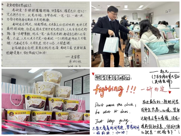 全员参与学生考研过程。领导班子高度重视学生考研工作,积极参与学生考研动员、考研慰问等活动。辅导员和班主任注重学风建设,做好思想引领和日常管理。针对一些考研犹豫不决的学生、符合调剂资格的学生、考研落榜学生,辅导员和班主任均会进行谈心谈话。此外,辅导员老师还深入学生宿舍,了解学生备考情况,对出现考前焦虑、缺少信心的同学及时给予关怀,为同学们传授考研经验、学习方法以及心理自我调节等方面的心得。