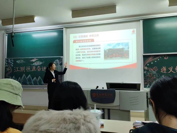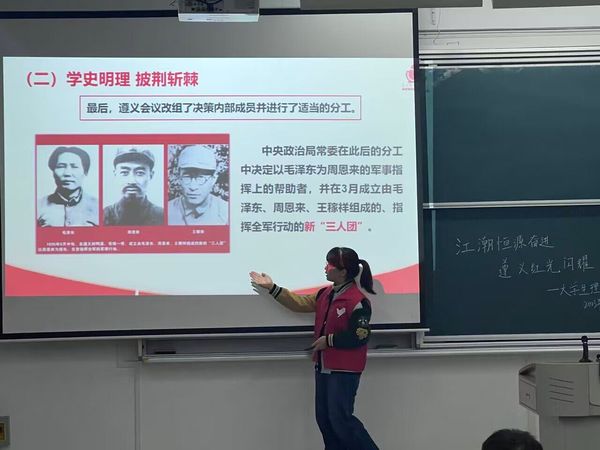 宣讲团成员从遵义会议的时代背景、基本过程、历史意义以及遵义会议精神的主要内涵、当代价值等方面展开讲解,旨在让更多同学深刻领会以“坚定信念、坚持真理、独立自主、团结统一”为基本内涵的遵义会议精神,赓续革命传统,凝聚发展共识,走好新时代的长征路。宣讲过程中,宣讲员穿插讲解当地的风土人情、民俗趣事,寓教于乐,让同学们印象深刻。