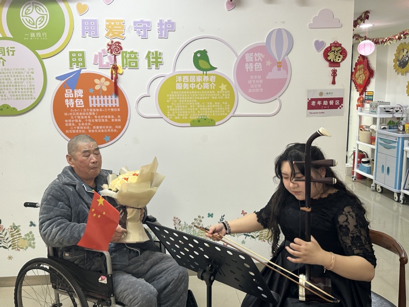 “我还想听《二泉映月》。”一位行动不便的老人轻声说道。音乐学院志愿者曹琛昕同学快速取出二胡,熟练演奏了二胡曲《二泉映月》。老人听完后,热泪盈眶,握住曹同学的手,颤抖地说:“谢谢你,太谢谢你了!”这感人的一幕发生在音乐学院大学生志愿者走进洋西社区养老服务中心学雷锋联欢会接近尾声时。