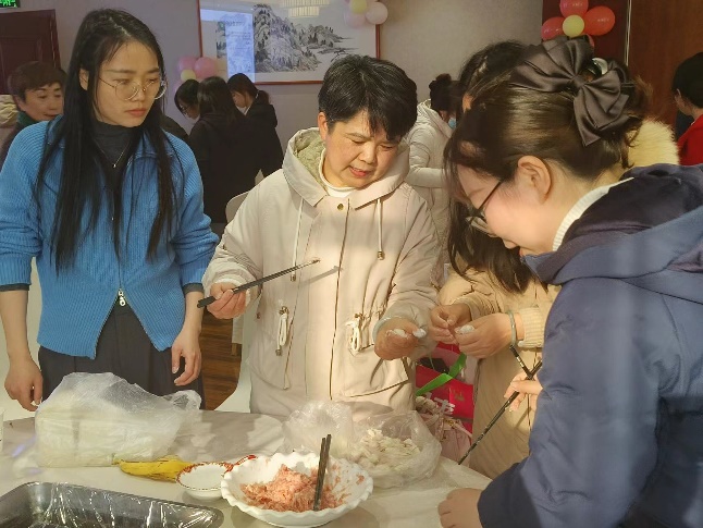 活动现场氛围温馨欢快,参与活动的女教职工齐聚一堂,有的负责和面,有的负责擀皮,有的负责调馅,大家不时相互讨论、分工合作、传授经验,共同提升包饺子技能。大家积极参与,不亦乐乎,通过辛勤劳动,把欢乐、希望与祝福都包进了圆鼓鼓的饺子中。