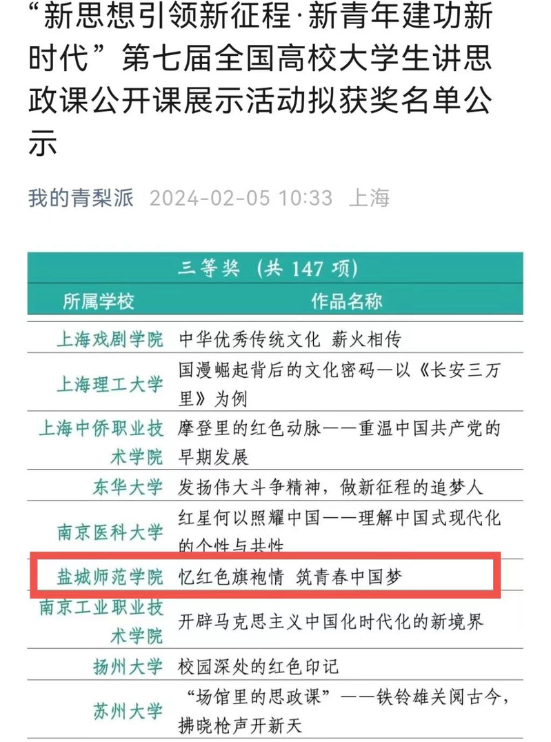 近日,由教育部高校思政课教学指导委员会主办,南开大学承办的习近平新时代中国特色社会主义思想大学习领航计划主题教育之“新思想引领新征程•新青年建功新时代”——第七届全国高校大学生讲思政课公开课展示活动公布获奖名单,我校马克思主义学院选送的作品《忆红色旗袍情 筑青春中国梦》荣获三等奖。该获奖作品由姚雨佳担任主讲人,卢沛敏、史姝航、朱超、苑欣瑶、钱天恩共同完成。作品指导老师有王志国、张冠楠、陈爱娟、顾莉等。