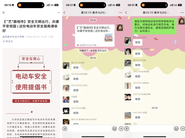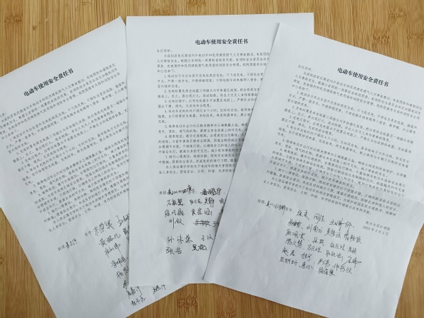 开展电动车安全教育专项行动。围绕开展电动车安全使用全面检查,组织学生签署电动车使用安全倡议书,召开安全教育主题班会,从行车安全、停车安全、充电安全等方面强化学生电动车使用安全意识。组织学生观看电动车交通安全学习视频,强化学生应对突发事故的能力。利用学院微信公众号平台、班级微信群,推送电动车安全使用知识,引导学生做文明交通的守护者。