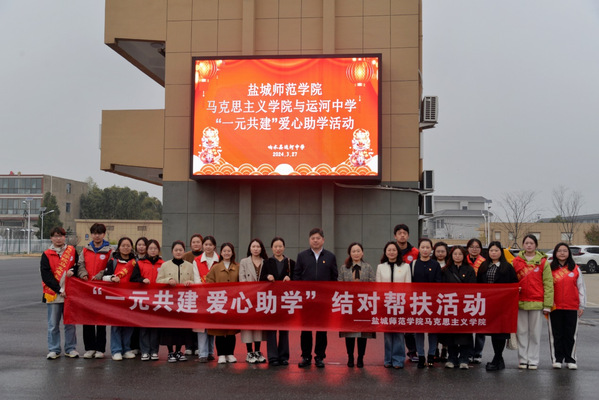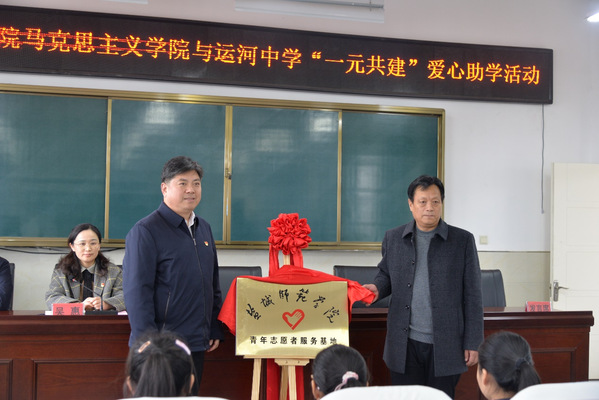 3月27日下午,马克思主义学院大学生赴响水运河中学,开展一年一度的“一元共建·爱心助学”活动。活动中,马克思主义学院党总支书记与响水运河中学校长蒋中华共同为学校青年志愿者服务基地揭牌。马克思主义学院思想道德与法治教研室主任成云卿为运河中学学生带来了“拒绝校园欺凌,维护身心健康”法治讲座。马克思主义学院思政课教师与响水运河中学政治教研组共同开展教学研讨,马克思主义学院思政专业学生为同学们带来两场思政公开课。