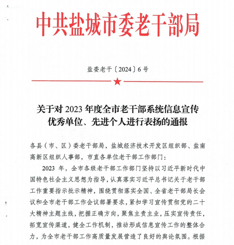 近日,我校离退休工作处被盐城市委老干部局表彰为“2023年度全市老干部系统信息宣传优秀单位一等奖”。