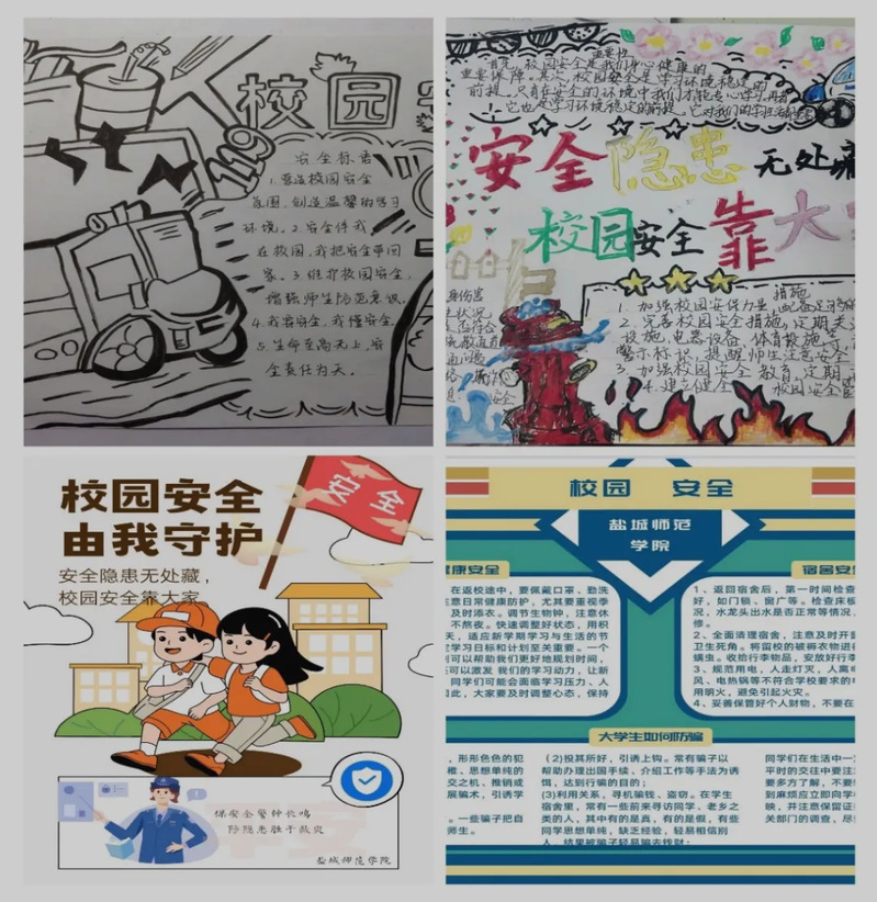 在“安全警钟要长鸣,防范知识在我心”校园安全我来绘比赛中,同学们以纸为媒,尽情抒发自己的灵感与热情。一张张色彩鲜艳的海报是视觉艺术与校园安全的完美融合,让安全知识由笔端流入心间,为同学们敲响校园安全的警钟。